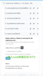 第二步,1.在借贷协议 read 5,输入地址查cusdt余额,2.write 19,输入查到的余额,把cusdt转成usdt